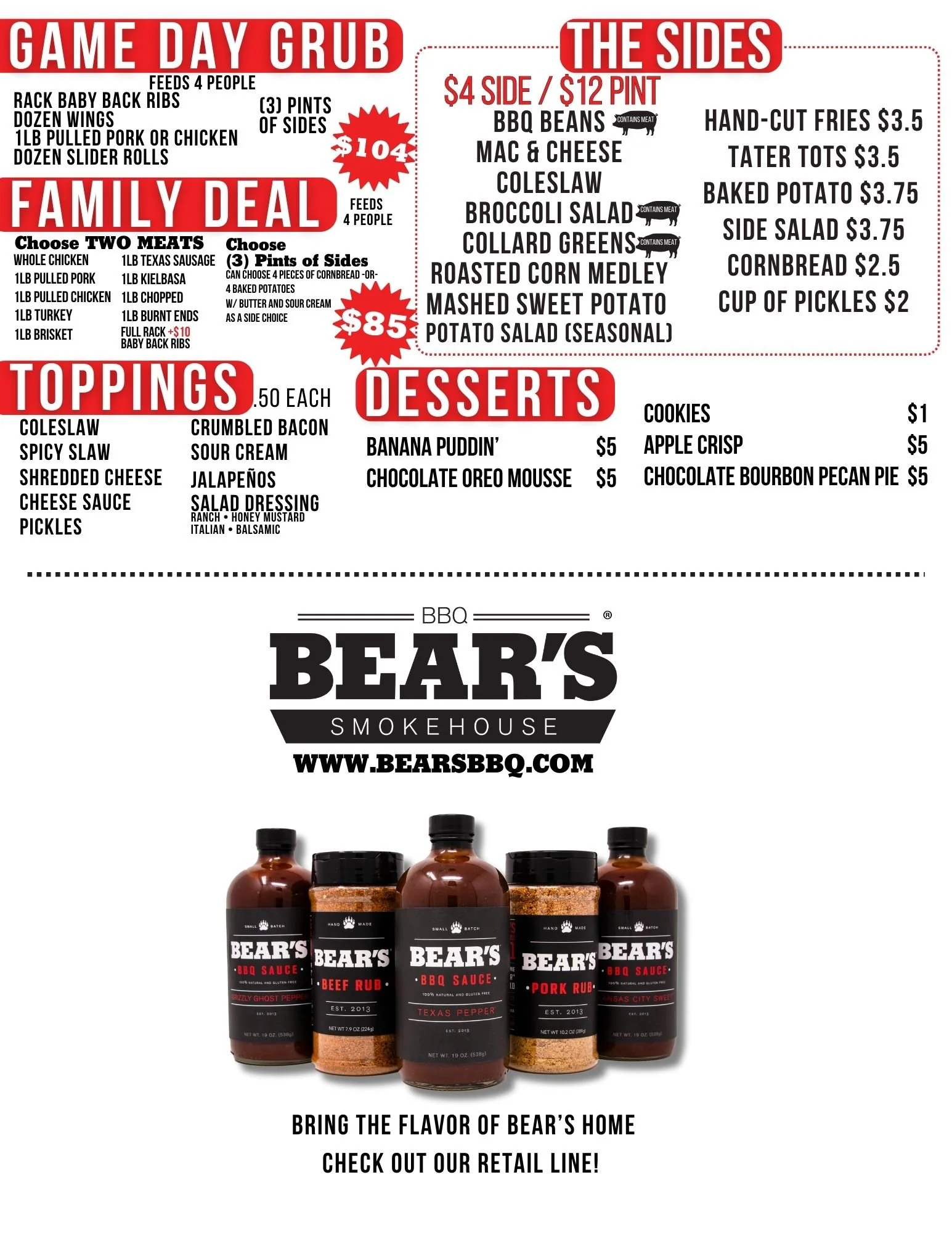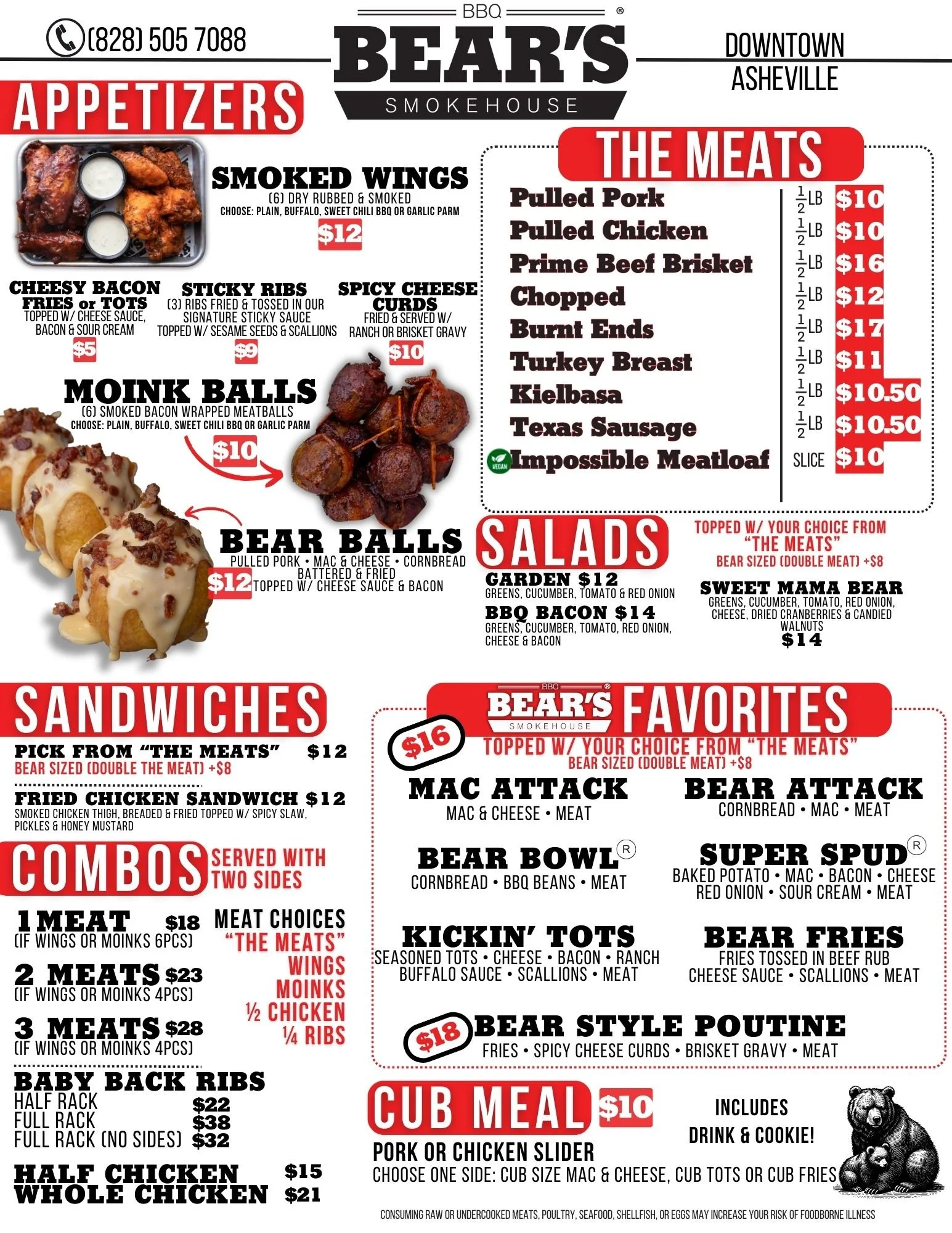 ABOUT Mission The Bear's Foundation careers Awards Follow Us! Locations & Menus all locations Asheville (Downtown Asheville) Asheville (@ SWEETEN CREEK BREWING) Hartford New Haven (LOCATED IN THE DISTRICT CAMPUS) South Windsor Windsor Storrs (LOCATED IN THE UCONN STUDENT UNION) ORDER NOW PICK UP delivery CATERING Events Events Connecticut North Carolina Shop Sauces & Rubs purchase gift cards Loyalty Catering Catering Thanksgiving Food Trucks Donations